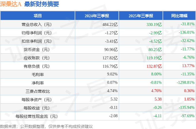 2025-11-02米兰体育,米兰体育官方网站,米兰体育APP下载据证券之星公开数据整理,近期深桑达A(000032)发布2025年三季报。截至本报告期末,公司营业总收入330.19亿元,同比下降31.81%,归母净利润-2.99亿元,同比下降136.01%。按单季度数据看,第三季度营业总收入95.84亿元,同比下降36.83%,第三季度归母净利润-2.01亿元,同比下降126.92%。本报告期深桑达A公司应收账款体量较大,当期应收账款占最新年报归母净利润比达3614.69%。