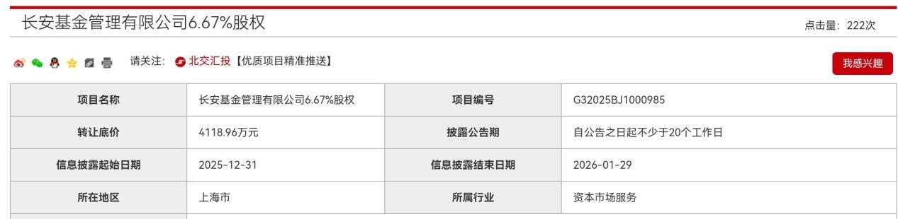 2026-01-04米兰体育,米兰体育官方网站,米兰体育APP下载近日,长安基金6.67%股权在北京产权交易所挂牌,转让方为兵器装备集团财务有限责任公司,底价为4118.96万元。记者注意到,这部分股权并不是第一次挂牌转让,早在2021年和2022年,就曾以3700万元的底价多次挂牌转让。