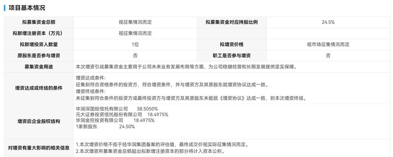 披露的信息显示,此次募集资金对应的持股比例达24.5%,增资价格不低于经华润集团备案的评估值,最终成交价视实际征集情况而定。