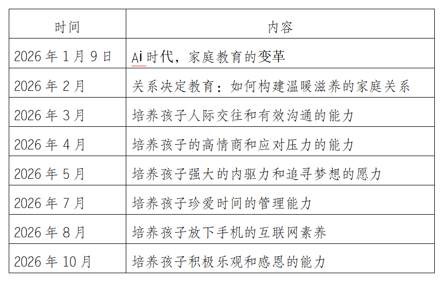 课程团队前期通过广泛调研,首季直播课程聚焦指导家庭如何培养孩子应对未来挑战的核心素养,包括如何构建温暖滋养的家庭关系、如何培养孩子的沟通交流能力、情绪管理能力、社交合作能力、内在驱动力、时间管理能力、互联网素养等等。课程内容摒弃空泛理论,突出实践导向,通过系统化、针对性的指导,助力家长破解教育困惑,提升家庭教育水平。
