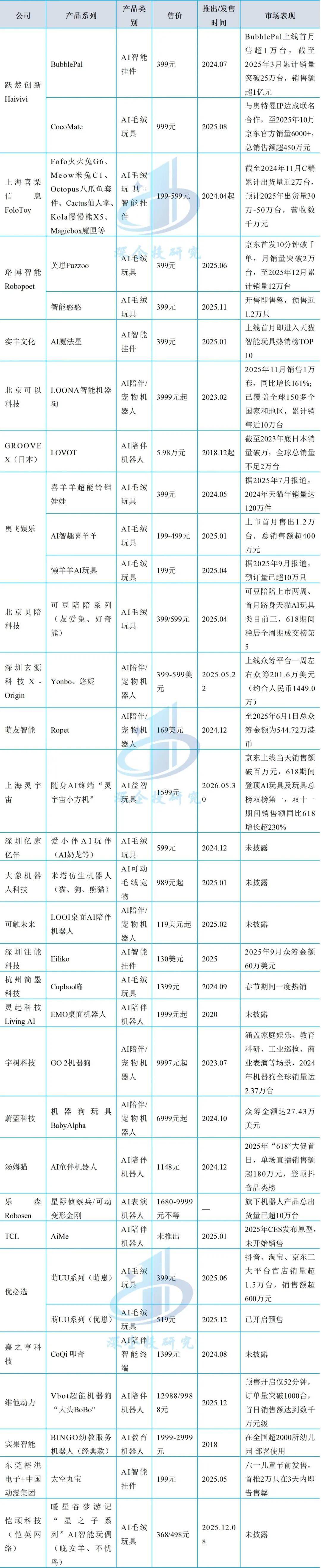 从产品形态上,AI毛绒玩具、AI智能挂件、儿童陪伴机器人、AI宠物、AI科技玩具都属于AI玩具范畴。按核心功能与场景,AI玩具可分为教育学习类、情感陪伴类和互动娱乐类玩具。按照价格与配置,AI玩具主要包含入门级(300元以内)、中端(300-1000元)、高端(1000元以上)三类,具体如下表所示。