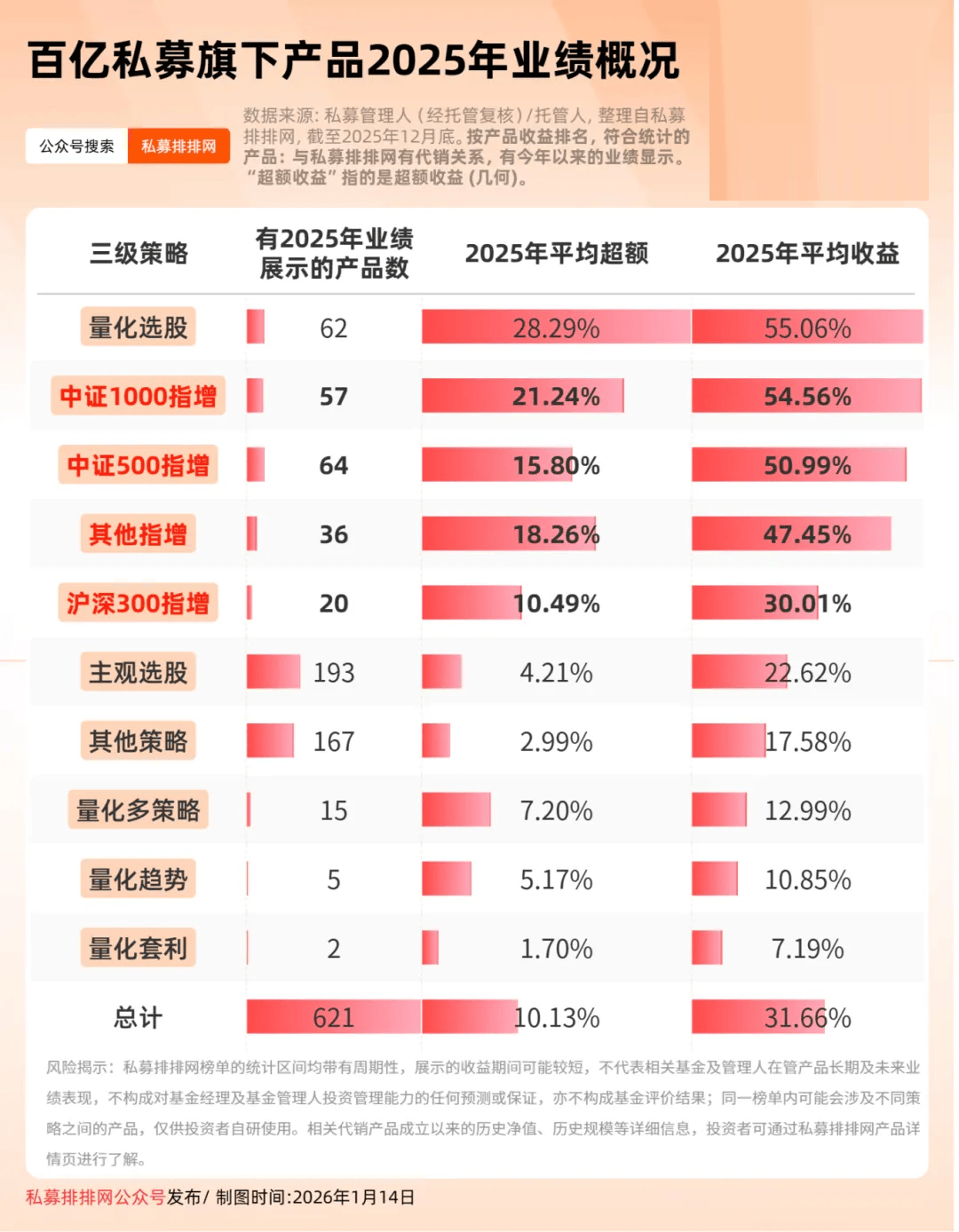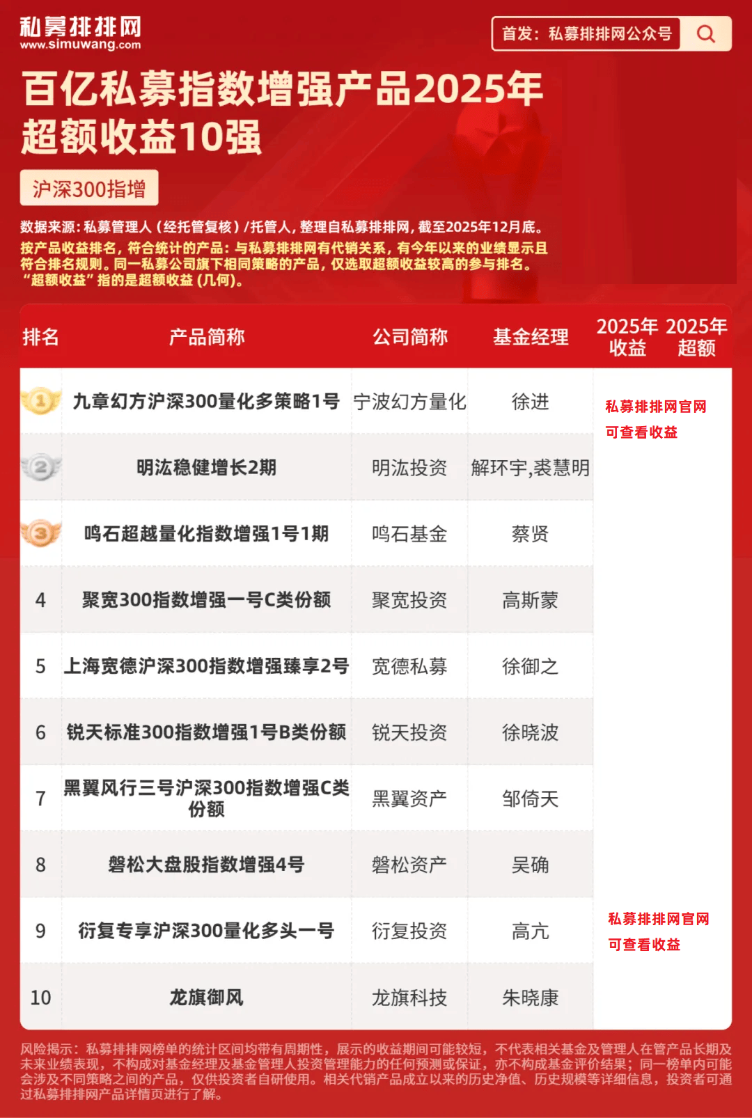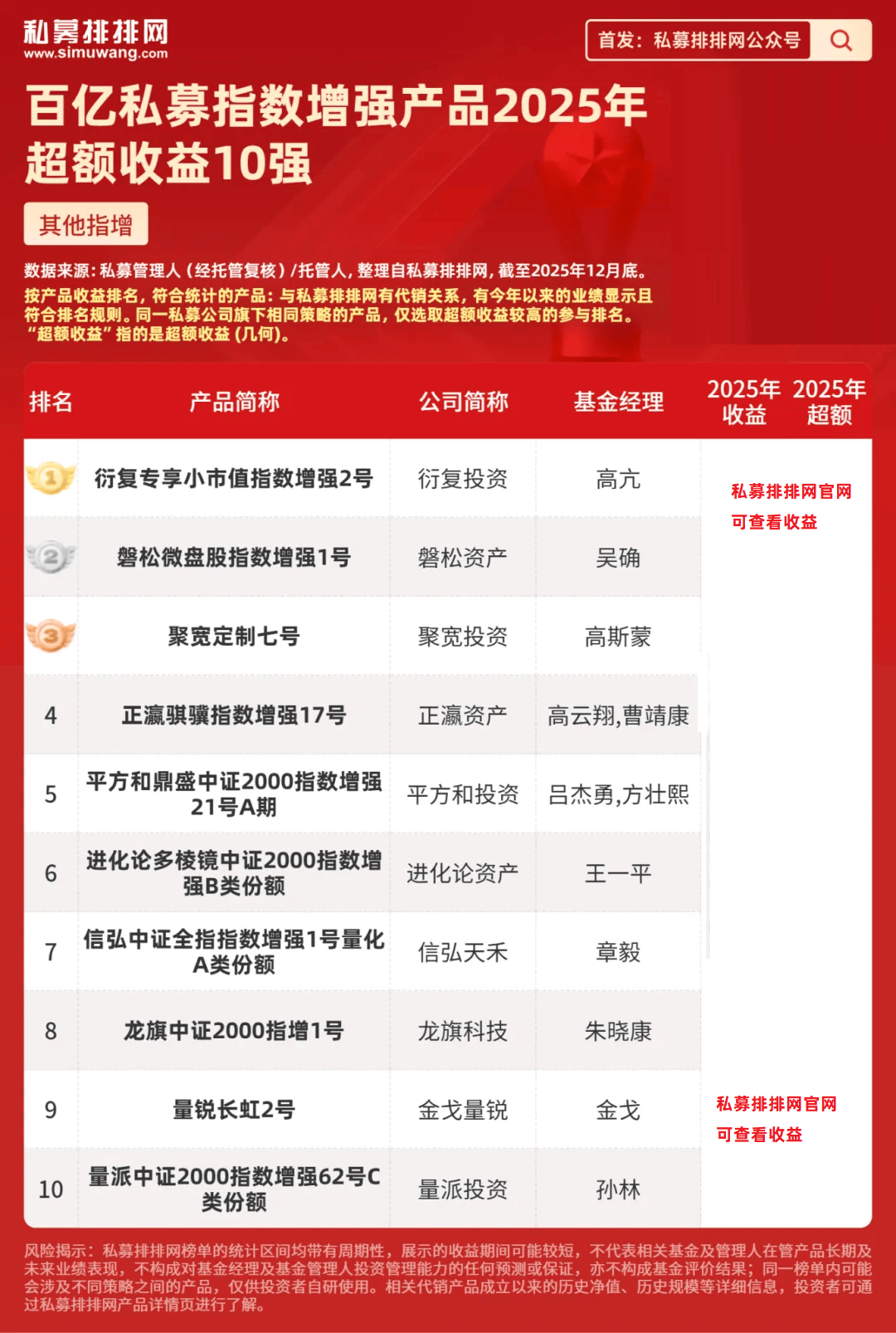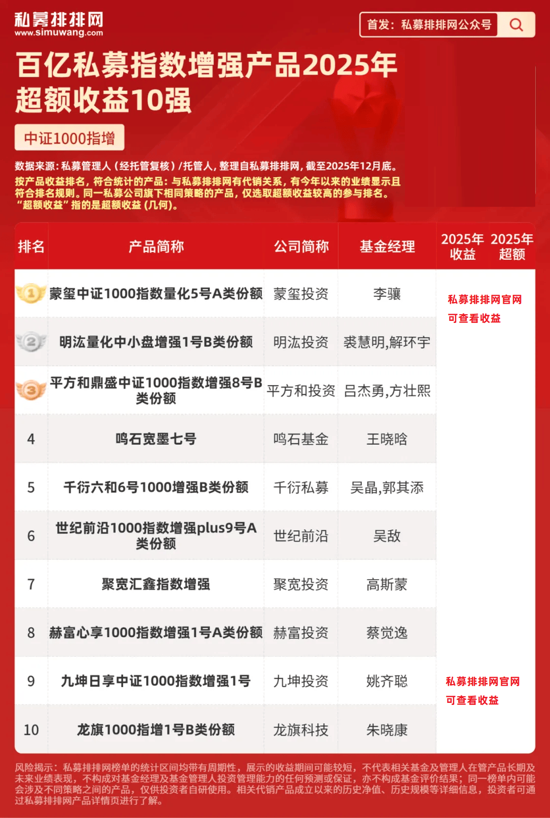 明汯投资裘慧明和解环宇共同管理的“明汯量化中小盘增强1号B类份额”位列第2,2025年超额收益、收益分别为***%、***%。