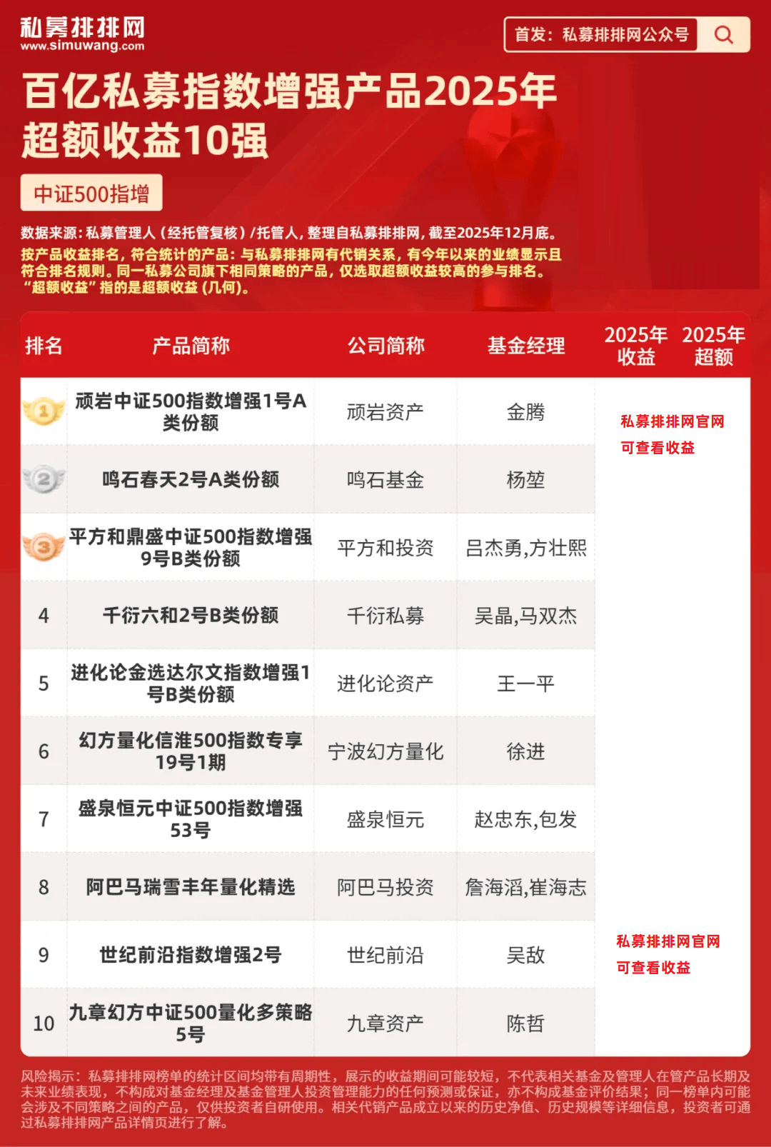 顽岩资产金腾管理的“顽岩中证500指数增强1号A类份额”摘得桂冠,2025年超额收益、收益分别为***%、***%。