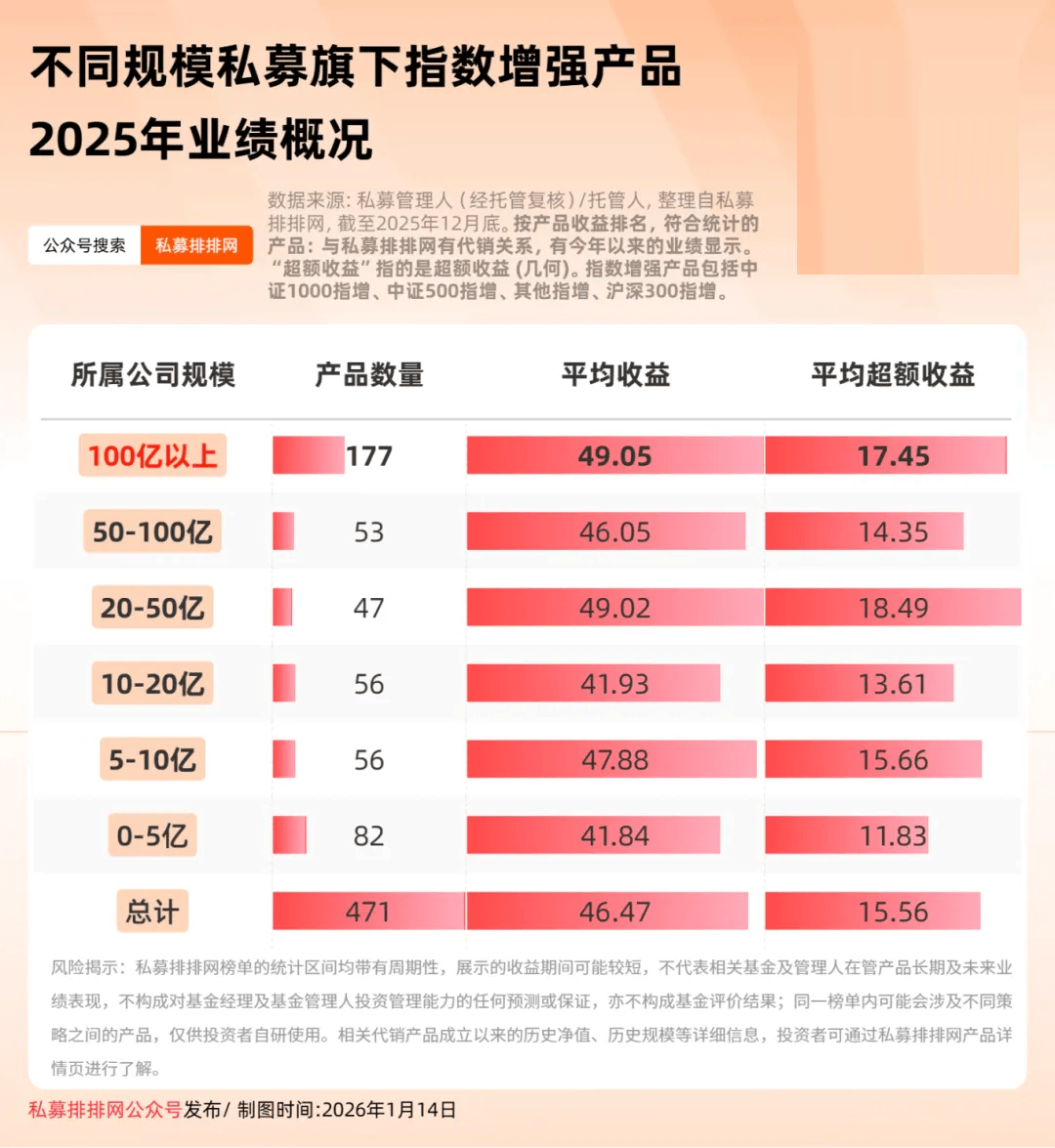 私募排排网数据显示,2025年有业绩展示的指数增强产品(包括中证1000指增、中证500指增、其他指增、沪深300指增)共有471只,平均收益为46.47%、平均超额收益为15.56%。按公司规模划分,百亿私募指数增强产品共有177只,数量最多,2025年平均收益为49.05%,领跑其他规模私募的指数增强产品;平均超额收益分别为17.45%,排名第2。