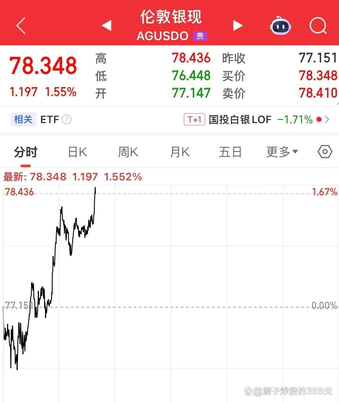 现货白银的波动更为剧烈,盘中涨幅一度扩大至6.5%,最高触及78.3349美元,收盘时涨幅仍达5.04%,报77.2335美元。