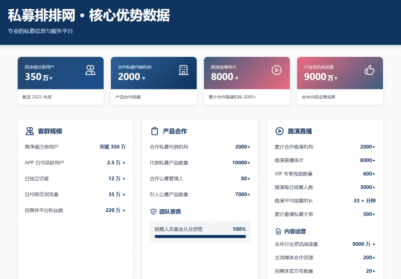 私募排排网客户类型多样化,拥有庞大的高净值用户群体和丰富的机构客户资源,截至2025年底,高净值注册用户突破350万,客户规模持续稳步增长。