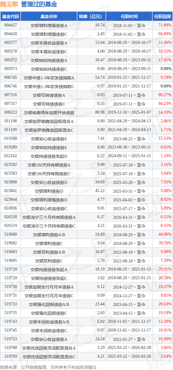 魏玉敏女士:厦门大学金融学硕士、学士。2012年至2013年任招商证券固定收益研究员,2013年至2016年任国信证券固定收益高级分析师。2016年加入交银施罗德基金管理有限公司,曾任固定收益部基金经理,现任混合资产投资部基金经理。曾任交银施罗德丰晟收益债券型证券投资基金(2018年08月29日至2020年10月16日)、交银施罗德裕如纯债债券型证券投资基金(2018年08月29日至2023年09月11日)、交银施罗德纯债债券型发起式证券投资基金(2018年08月29日至2025年01月15日)、交银施罗德丰润收益债券型证券投资基金(2018年11月02日至2021年12月16日)、交银施罗德中债1-3年农发行债券指数证券投资基金(2019年01月23日至2021年12月16日)、交银施罗德裕泰两年定期开放债券型证券投资基金(2019年12月10日至2025年01月07日)、交银施罗德鑫选回报混合型证券投资基金(2021年04月29日至2024年05月22日)的基金经理。现任交银施罗德增利债券证券投资基金(2018年08月29日至今)、交银施罗德增利增强债券型证券投资基金(2018年11月02日至今)、交银施罗德可转债债券型证券投资基金(2019年07月11日至今)、交银施罗德安心收益债券型证券投资基金(2022年01月27日至今)、交银施罗德双利债券证券投资基金(2022年08月18日至今)、交银施罗德强化回报债券型证券投资基金(2023年04月15日至今)、交银施罗德定期支付月月丰债券型证券投资基金(2024年12月27日至今)、交银施罗德优选回报灵活配置混合型证券投资基金(2025年03月22日至2026年03月28日)的基金经理、交银施罗德180天持有期债券型证券投资基金(2025年07月18日至今)的基金经理。