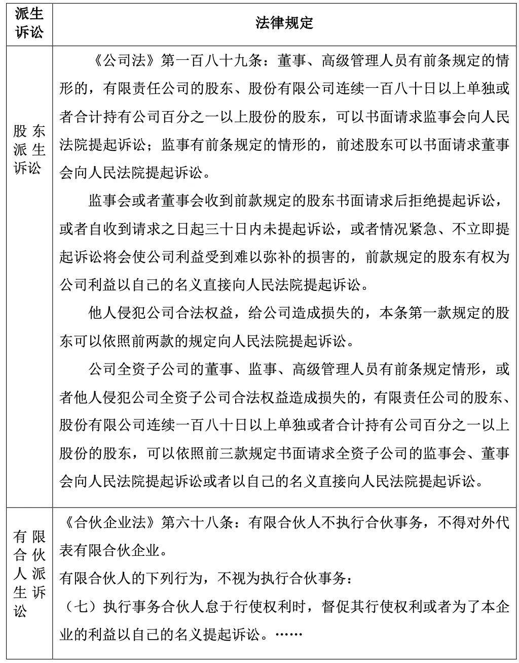 对于股东派生诉讼和有限合伙人派生诉讼,《公司法》和《合伙企业法》都有明确的规定。公司型私募基金投资人以股东派生诉讼路径进行救济或者合伙型私募基金投资人以有限合伙人派生诉讼路径进行救济,法律有明确的规定,本文不再赘述。《公司法》和《合伙企业法》关于股东派生诉讼和有限合伙人派生诉讼的具体规定如下:
