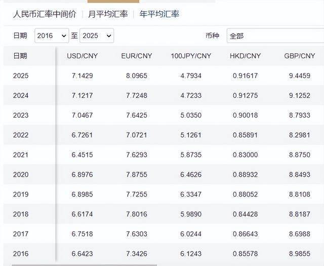 但从2022年开始,人民币对美元汇率一直在下降,到了2025年,人民币全年对美元的平均汇率只有7.1429,相当于4年时间,人民币对美元汇率至少贬值了10.7%。