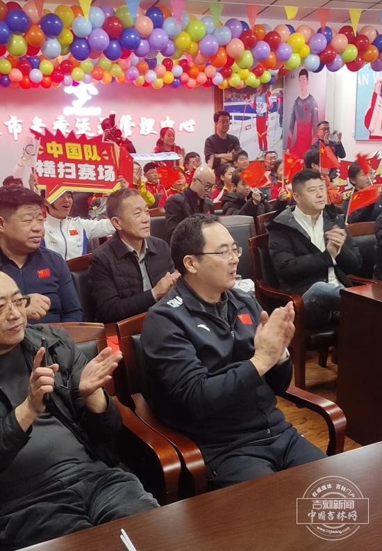 长春市冬季运动管理中心观赛现场气氛热烈,省、市体育局领导与教练员、运动员齐聚一堂,通过大屏幕实时关注万里之外的赛场战况,共同为中国冰雪健儿加油助威。